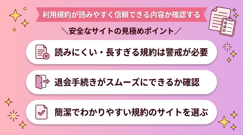- 利用規約が読みやすく信頼できる内容か確認する