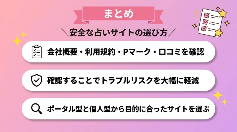 安全な占いサイトを選ぶポイントは、会社概要・利用規約・Pマークの・口コミや評価の確認をすることです!